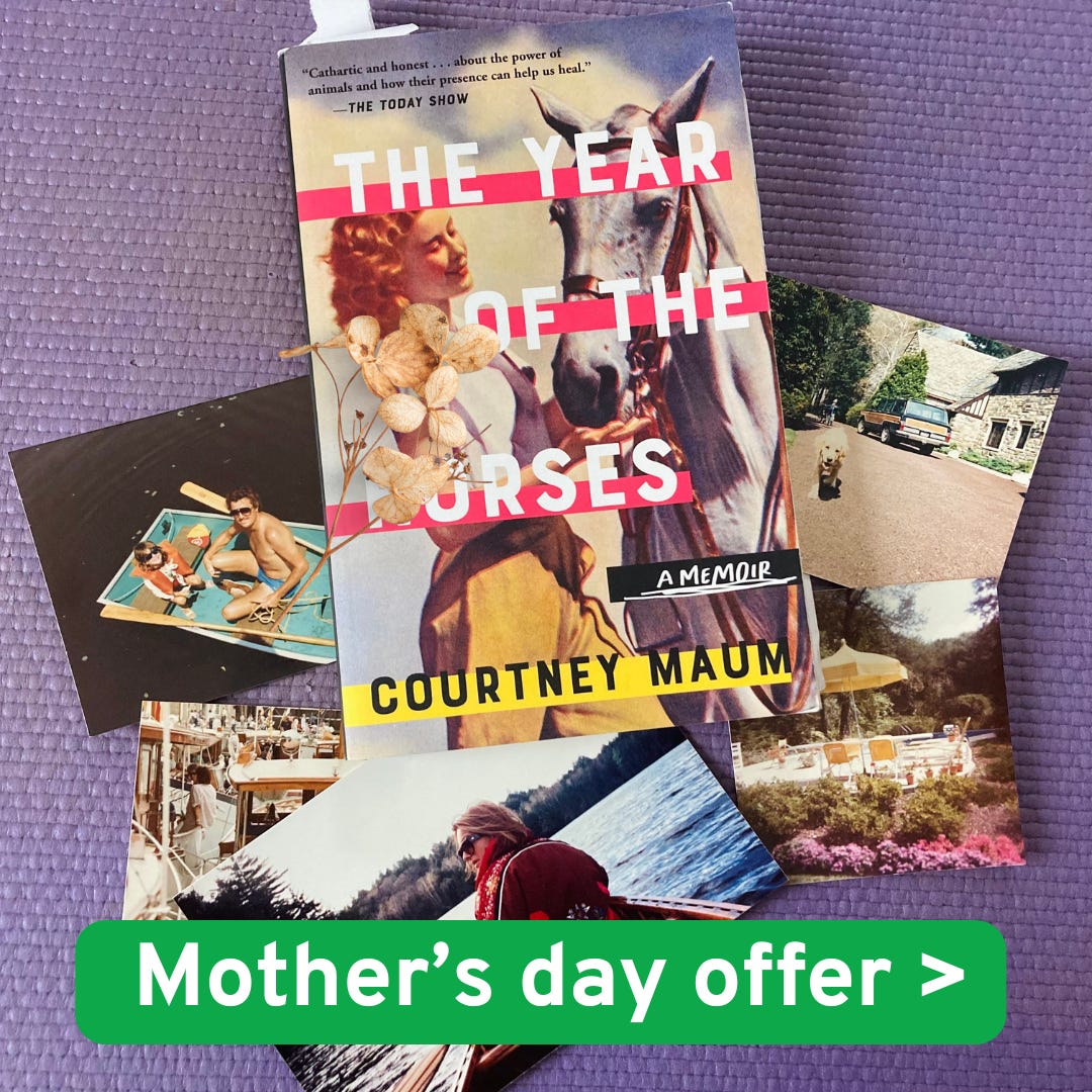 For people who email me with proof that they have purchased a copy of my memoir THE YEAR OF THE HORSES, I will send on a handwritten card and a signed book plate to the recipient of their choice. More about the offer guidelines in a sec, but first I want to talk about what makes this book a special one for mothers.