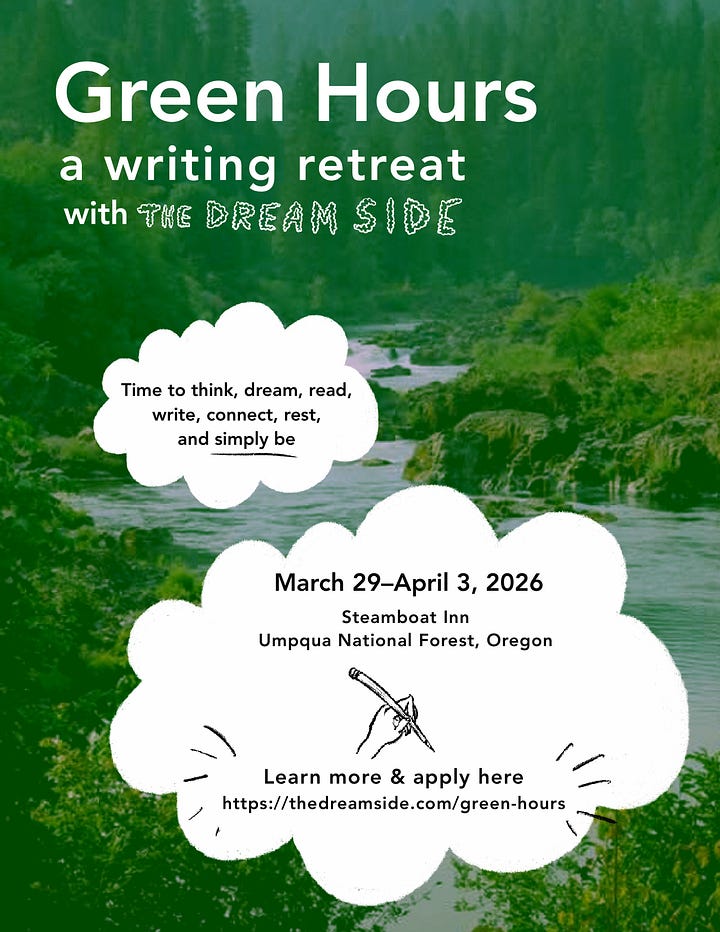 Escape to Oregon this spring: Have you been to the pacific northwest in early spring? Let me tell you, it is a fertile place to be, and I can’t imagine a more creatively fertile getaway than “Green Hours,” a five-night retreat that the Dreamside crew is running at otherworldly Steamboat Inn. The very team behind “Yes, Molecule” will be your teachers for this getaway: Meng Jin, Rachel Khong, Susanna Kwan, and Shruti Swamy. The retreat is from March 29th to April 3rd. Applications accepted and reviewed on a rolling basis. Learn more here!