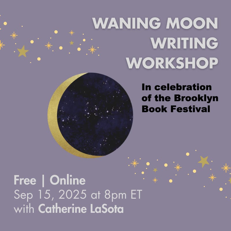 to look at the descriptive paragraph and opening page of an upmarket/literary novel with multiple perspectives. Before we meet Shannon and her material, I have a fun (and free!) September workshop for your radar.Free workshop and a fall support group to banish imposter syndrome: For anyone who hasn’t attended the Brooklyn Book Festival, the festival itself is amazing and chock-full of activities, but I have a soft spot for the creative happenings, tutorials and parties that bookend the festival. One such event is a “Waning Moon Writing Workshop” led by the writer, creativity coach and my friend Catherine LaSota. With the BKBF aligning with a new moon this year, Catherine will integrate lessons from the waning moon (releasing what has run its course; preparing to set new, aligned intentions) for this workshop's writing prompts. Bring your journal, pen, and a tasty beverage for this free, one hour-long online class on Monday September 15th at 8pm EST. Register here for the workshop Zoom link and event reminders.