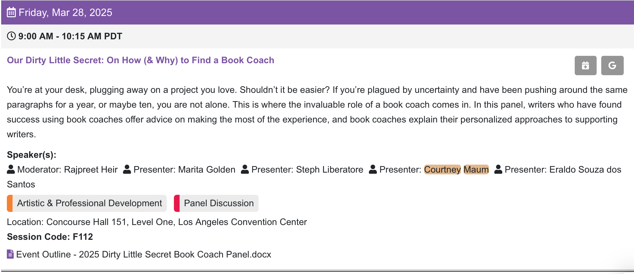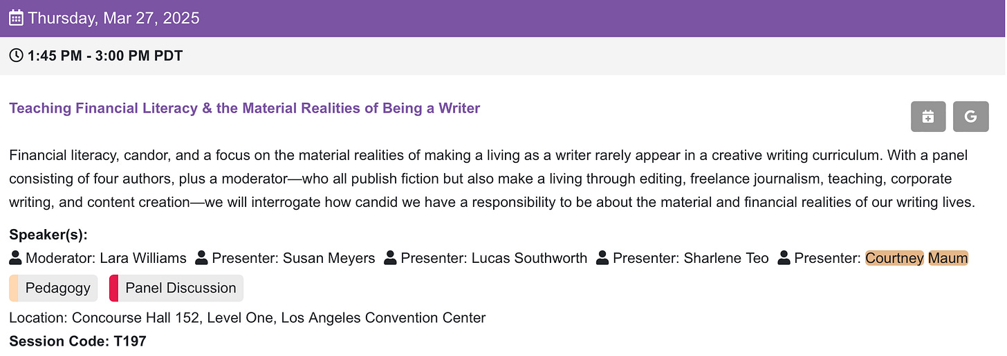 Okay, I’m off to do my Friday things. A reminder that these are my two panels at AWP— I can bring bookplates if anyone wants me to sign one in person and then bring it home and stick it inside a book of mine? I’ll also have business cards ;)