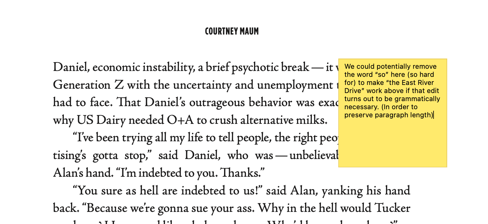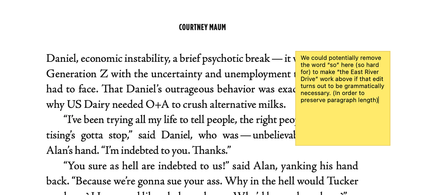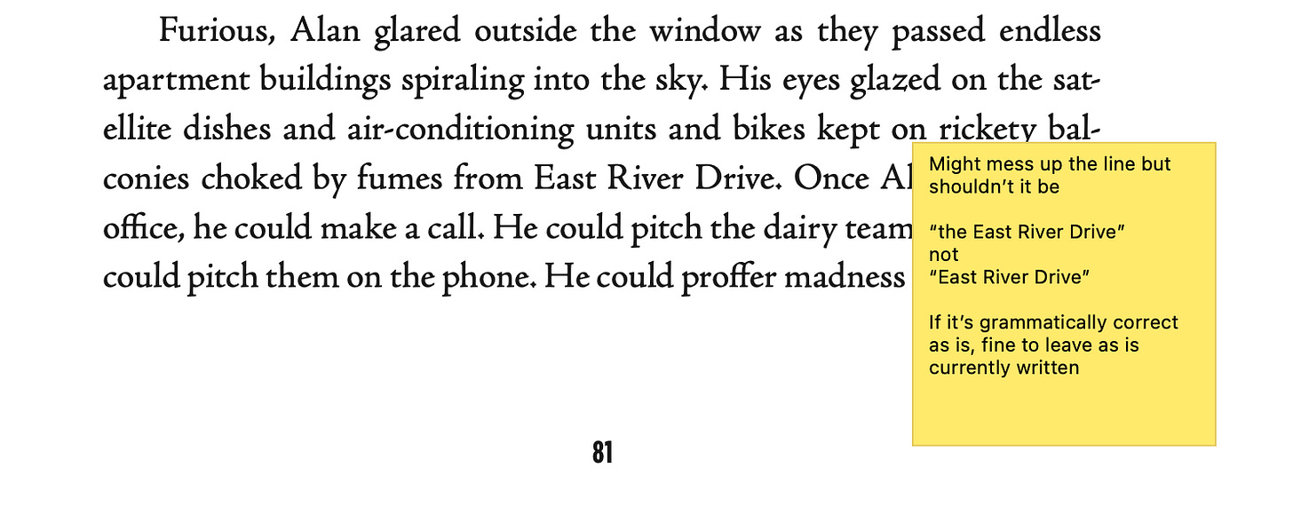 In the two screenshots below, you can see me querying whether it’s “East River Drive” and not “the East River Drive.” If it is, in fact, “the East River Drive” that would change the way the paragraph falls so in the second screenshot, I’m requesting they remove the word “so” to preserve the paragraph layout.