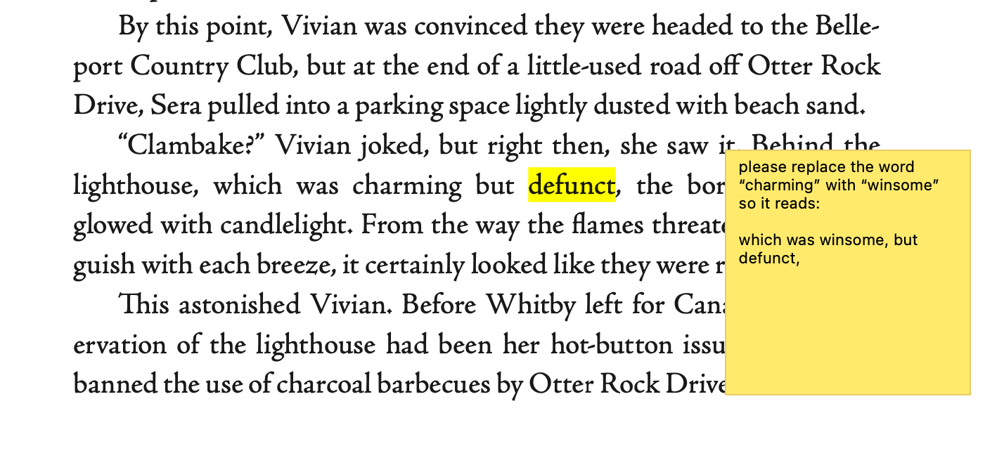 In the following and last example, I decided I hated the word “charming” in this context and found a replacement word (“winsome”) with nearly the same amount of characters so the paragraph layout wouldn’t change.